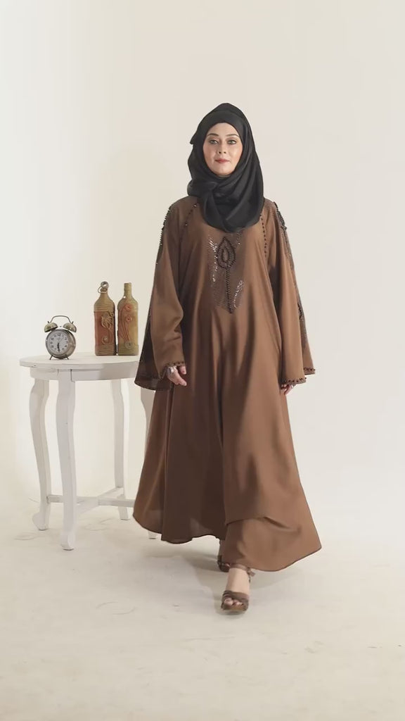 This statement abaya is adorned with delicate pearls embellished with Swarovski stones to add glam to this elegant designer piece. It is paired with classic black scarf for a more serene look.